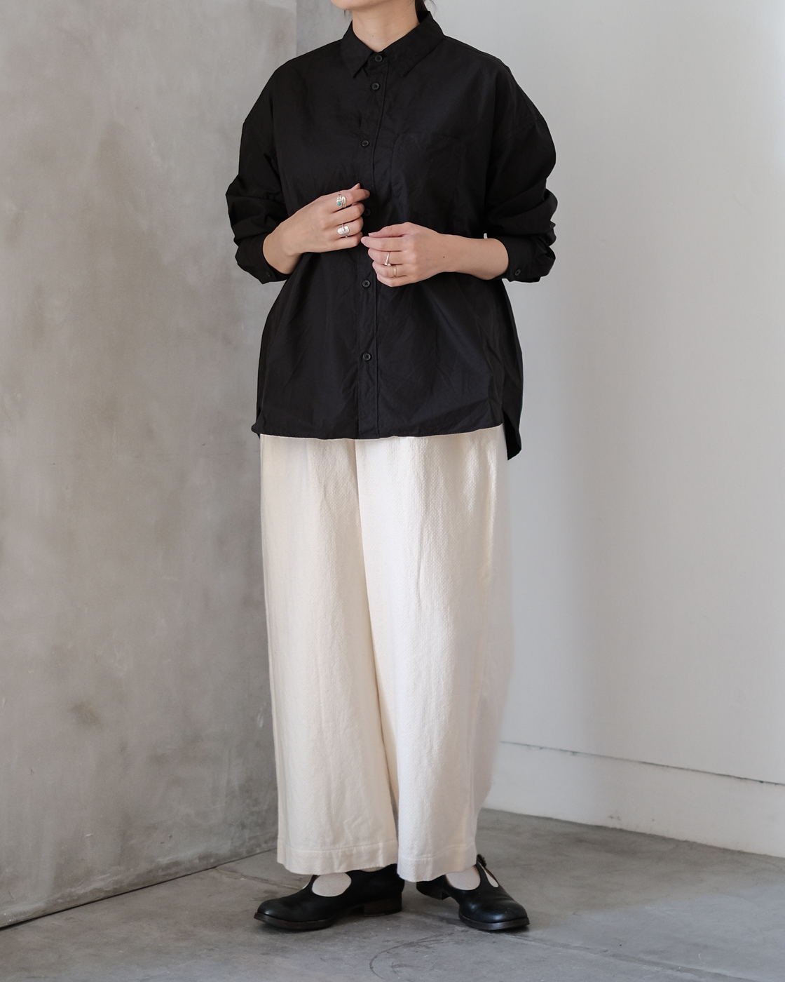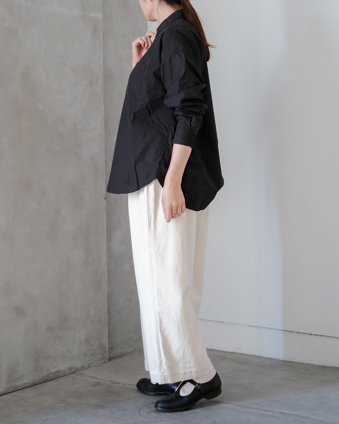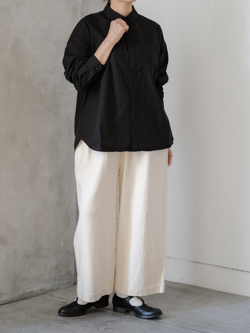 普段のゴーシュのシャツの中でも肩周り、身頃、袖、着丈とゆったりとした作りのシャツ。