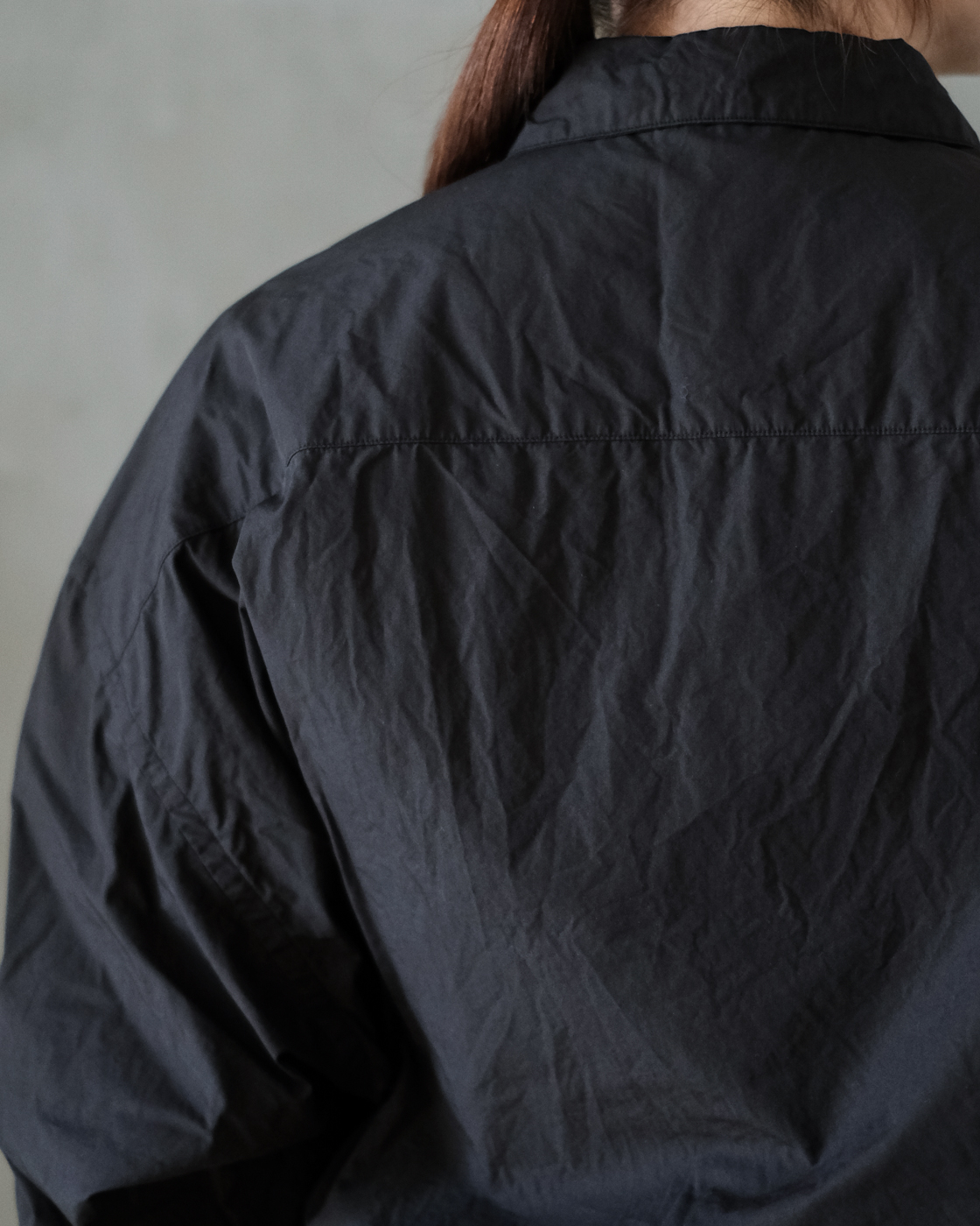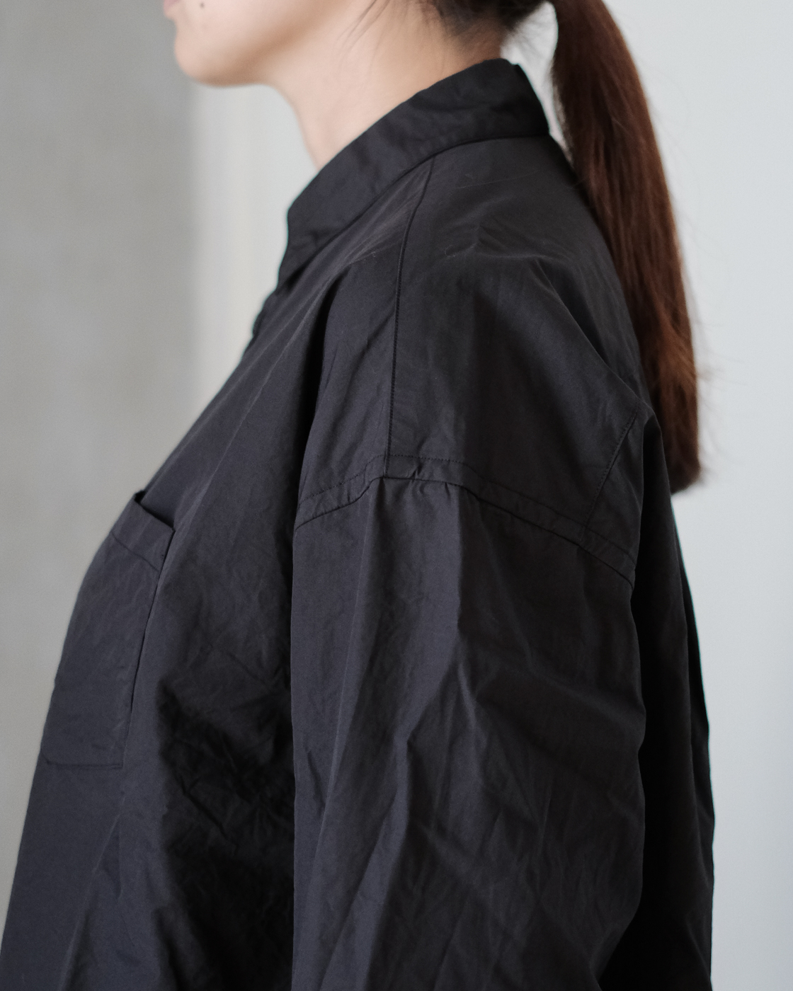 襟は小さめなので首元がすっきりと見え、ゆったりとした身幅と肩まわりの作りに、