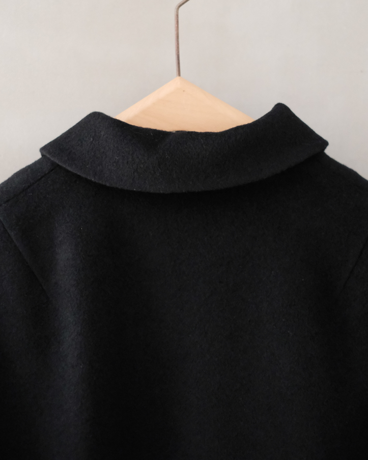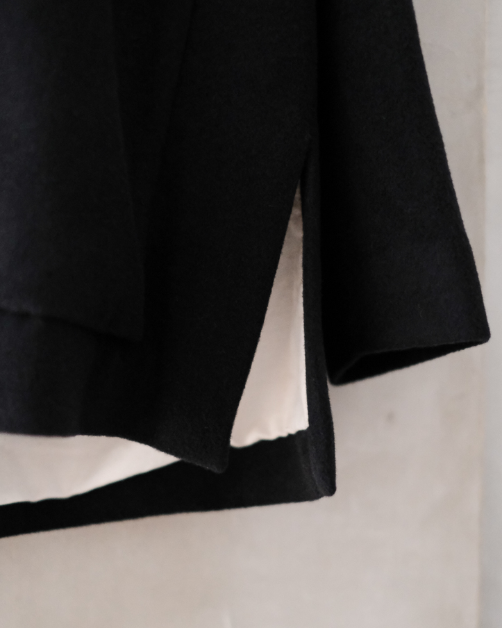 シンプルなコートのように見えますが、見頃の前と後で生地の分量の使い方が異なり、