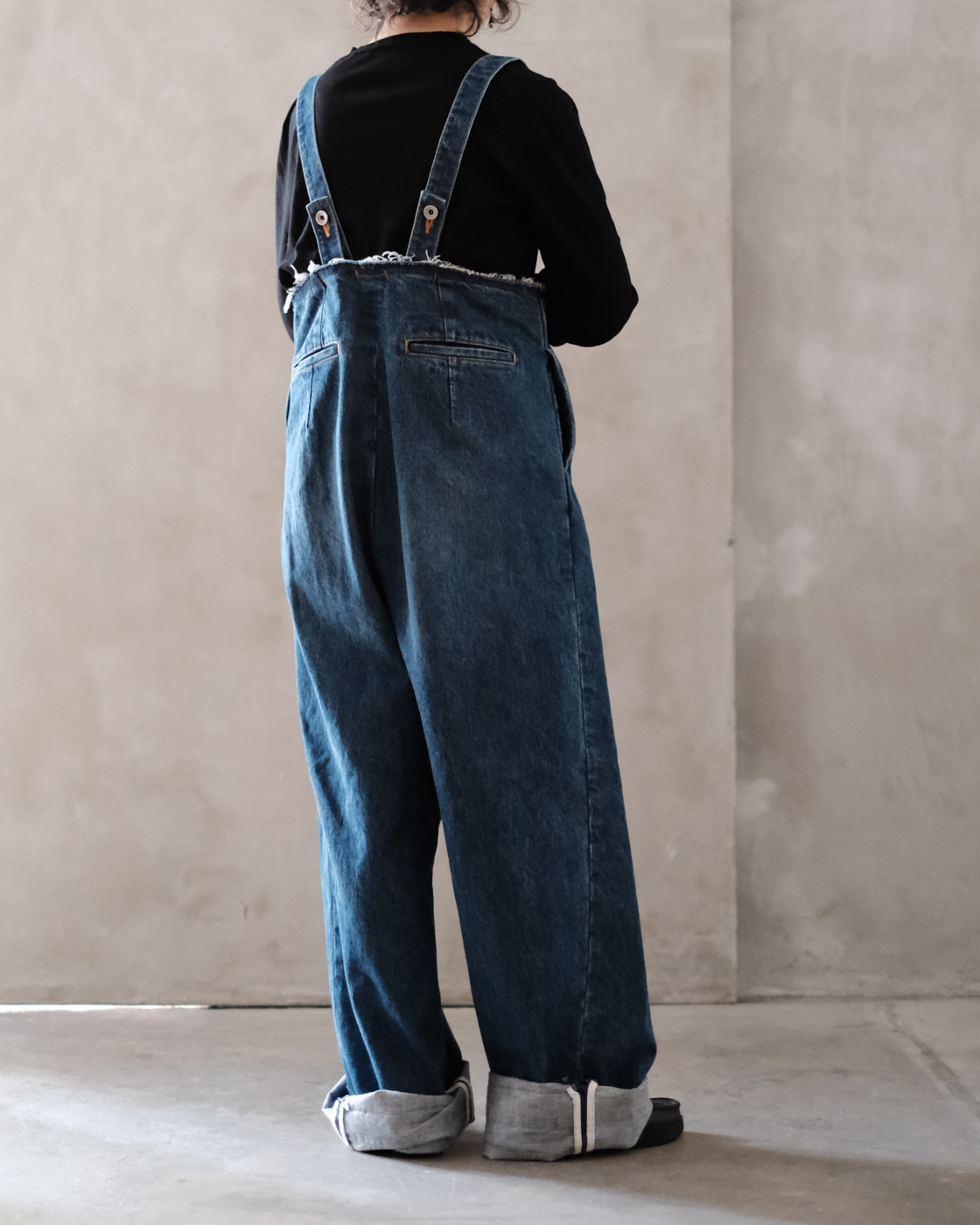 これまでのサスペンダーパンツよりもズドンと太い形にボリュームがあり、装いの主役として存在感のあるパンツです。