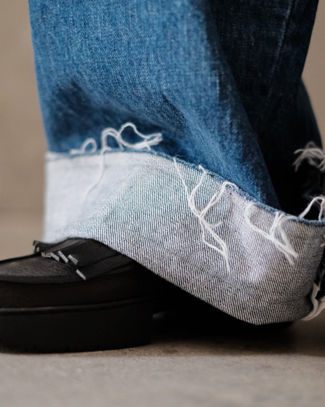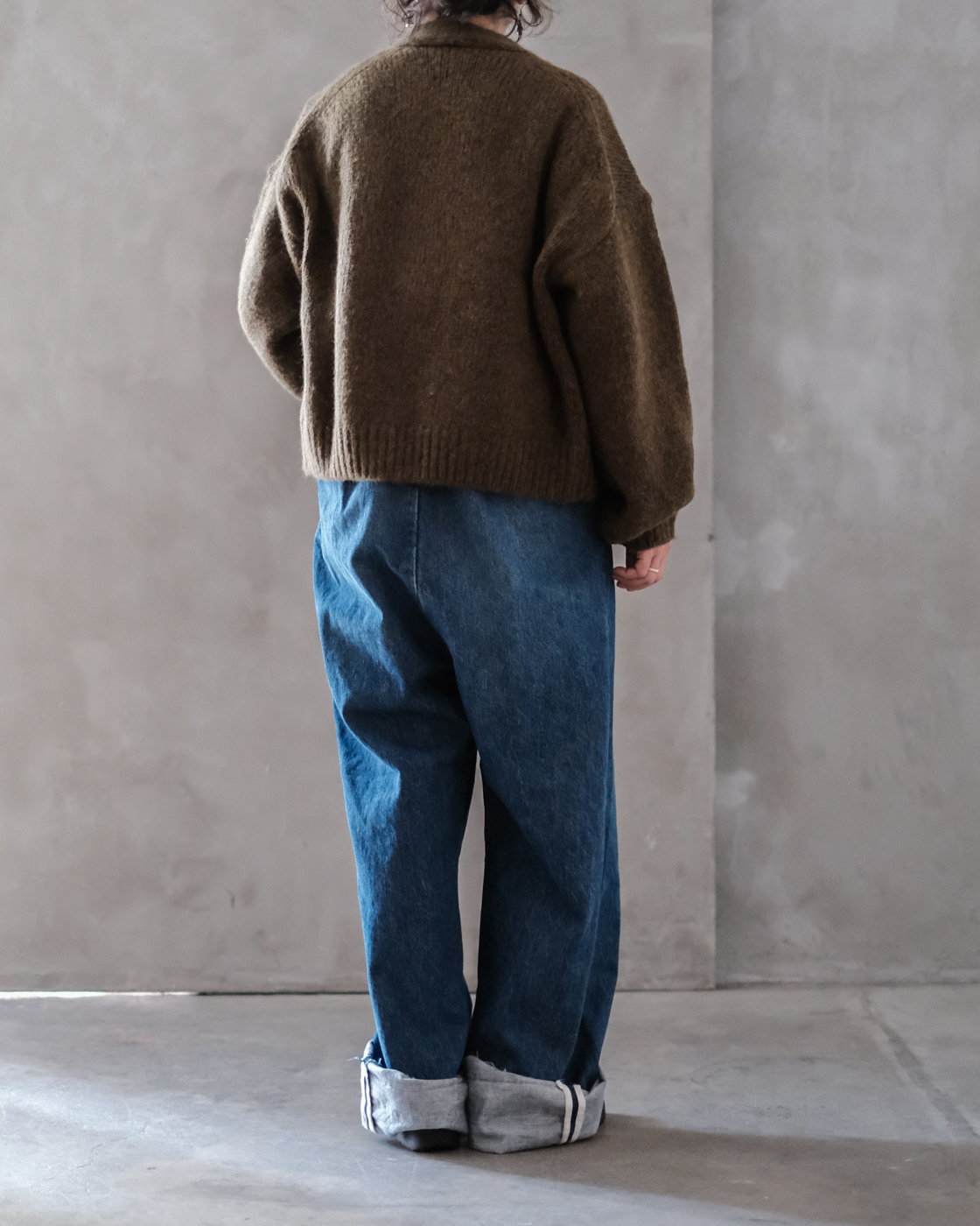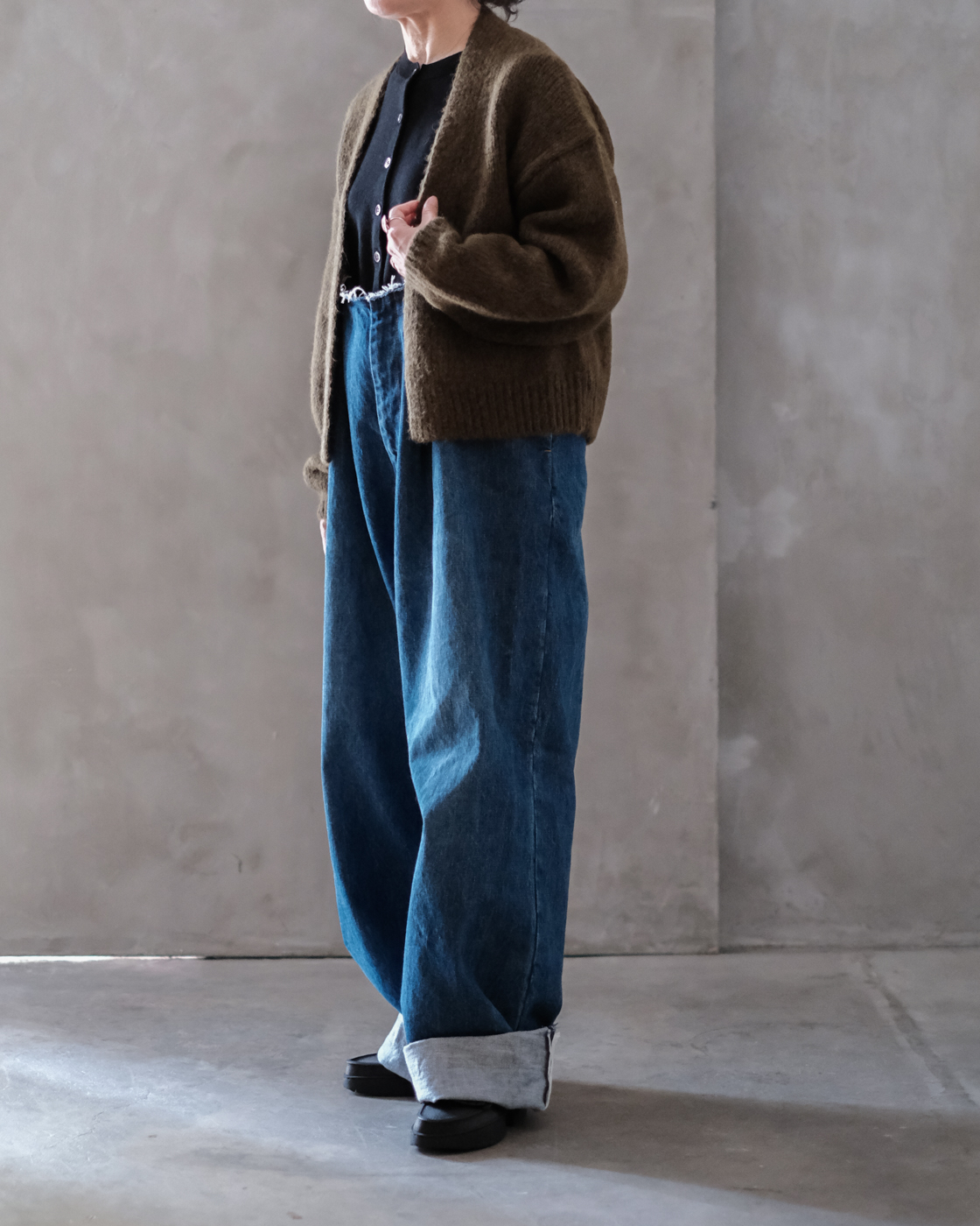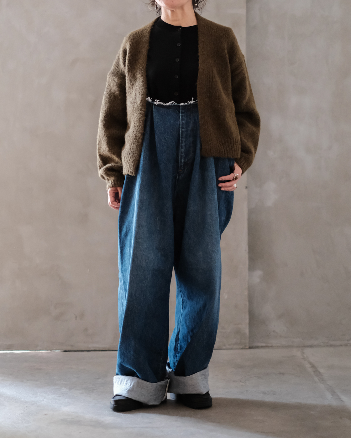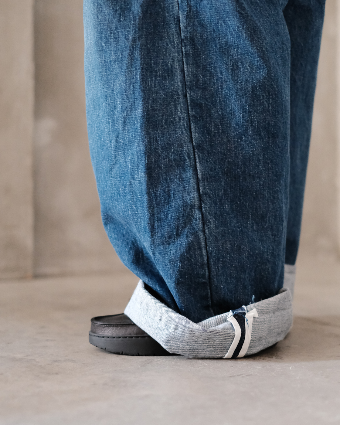 柔らかいデニム生地ならではの落ち感が相まって、太さがありつつも重さを感じない存在感あるシルエット。