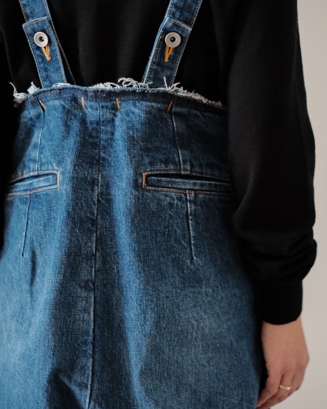 ウエストと裾の始末は、あえて切りっぱなしの仕様となっておりデザインとして楽しんでいただけます。