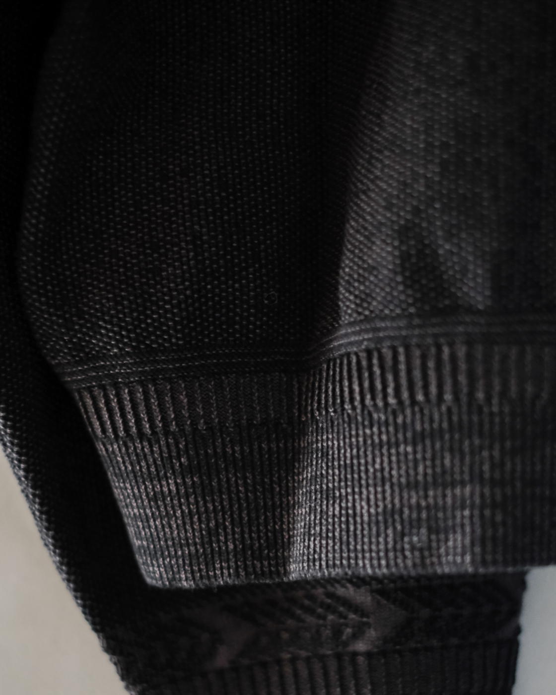 表目側と裏目側で異なる糸を編む技法を使用し、表と裏で糸のを変えて、2他で編むことで奥行きのある表情に仕上げてあります。