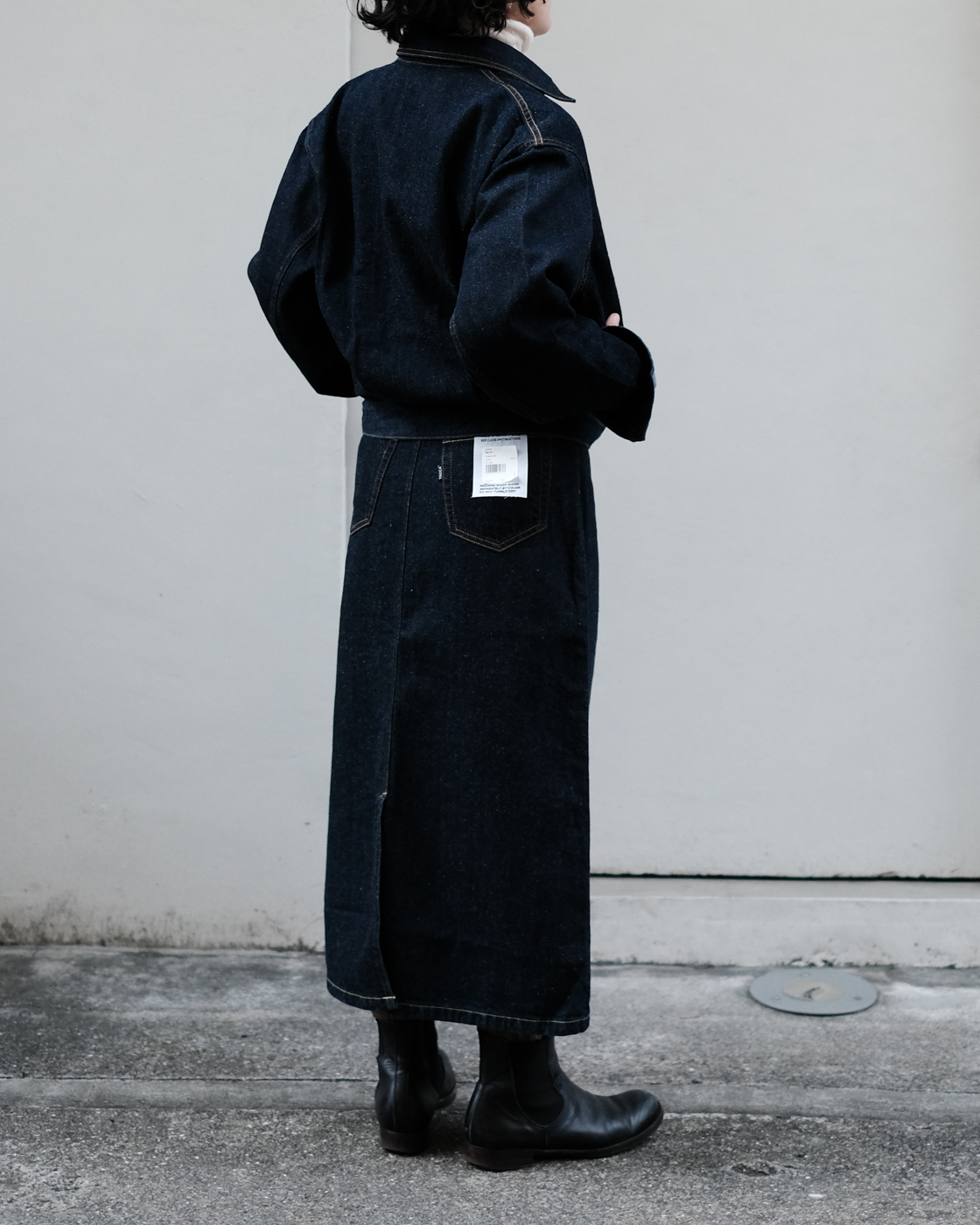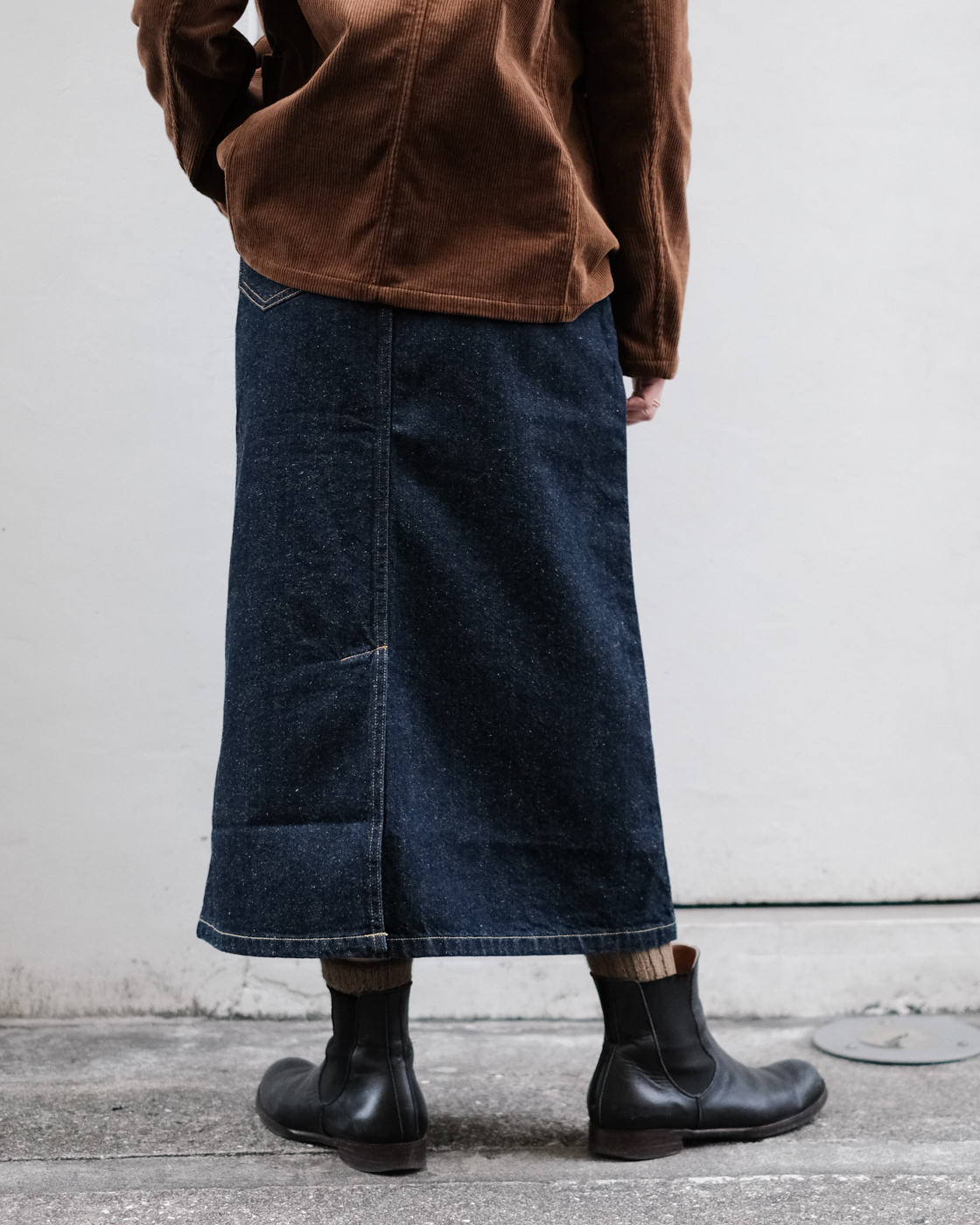 一見、タイトに見えますが後の裾にスリットが入っており、リラックスして穿いていただけます。