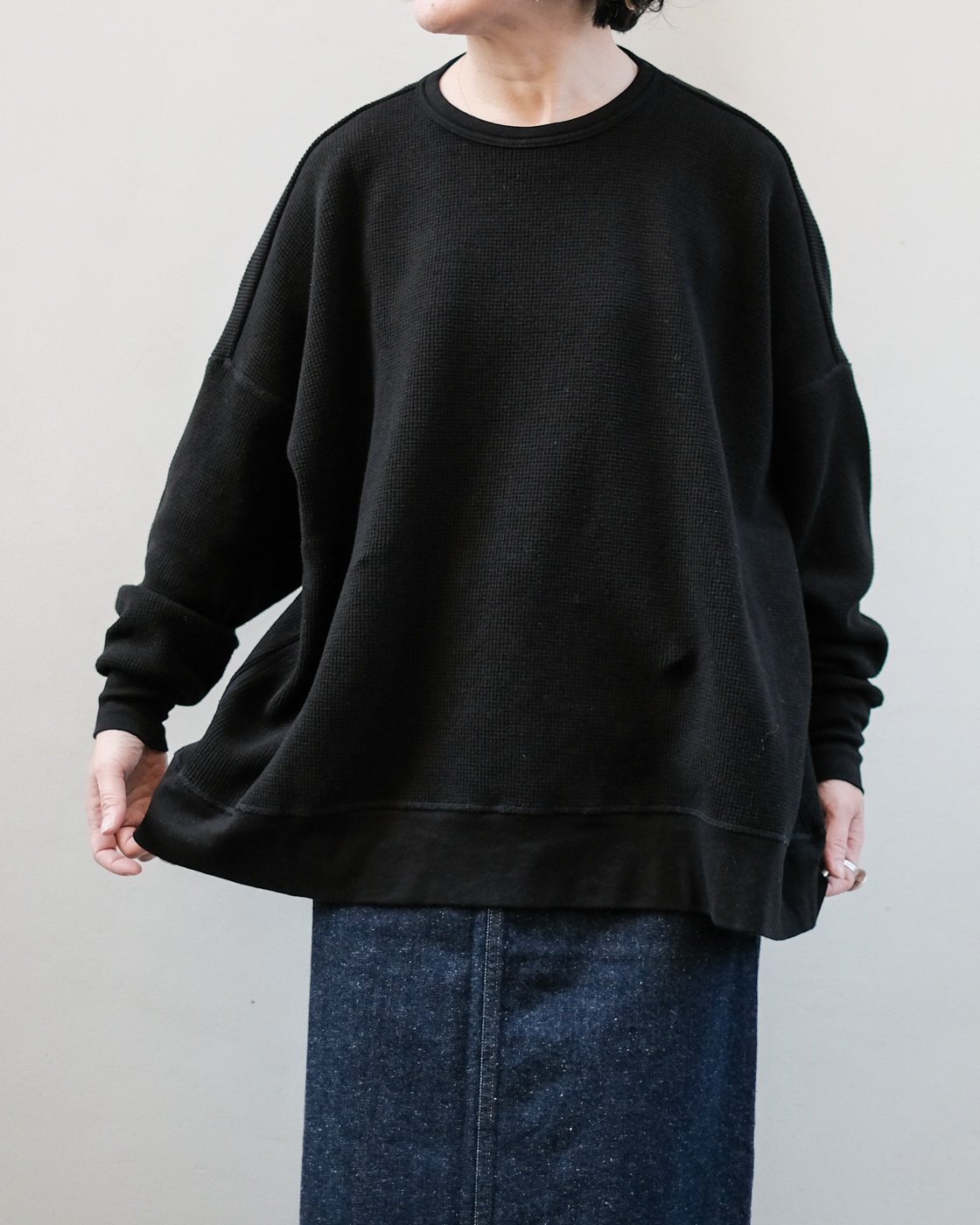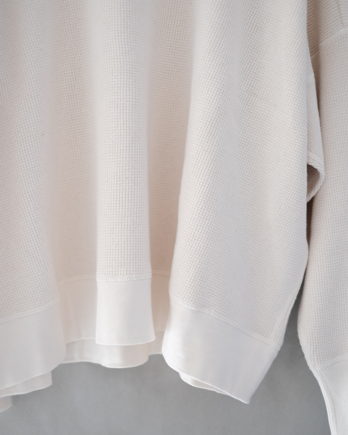 首元は細めのリブのクルーネックで、首が綺麗に見えるように形取られており、