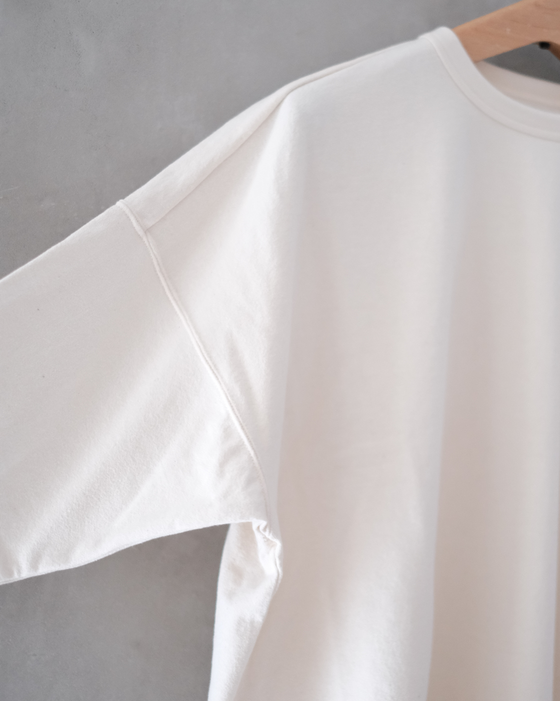 肩周りはゆとりがあり、袖口に向かったすっきり見えるように計算されたデザインです。