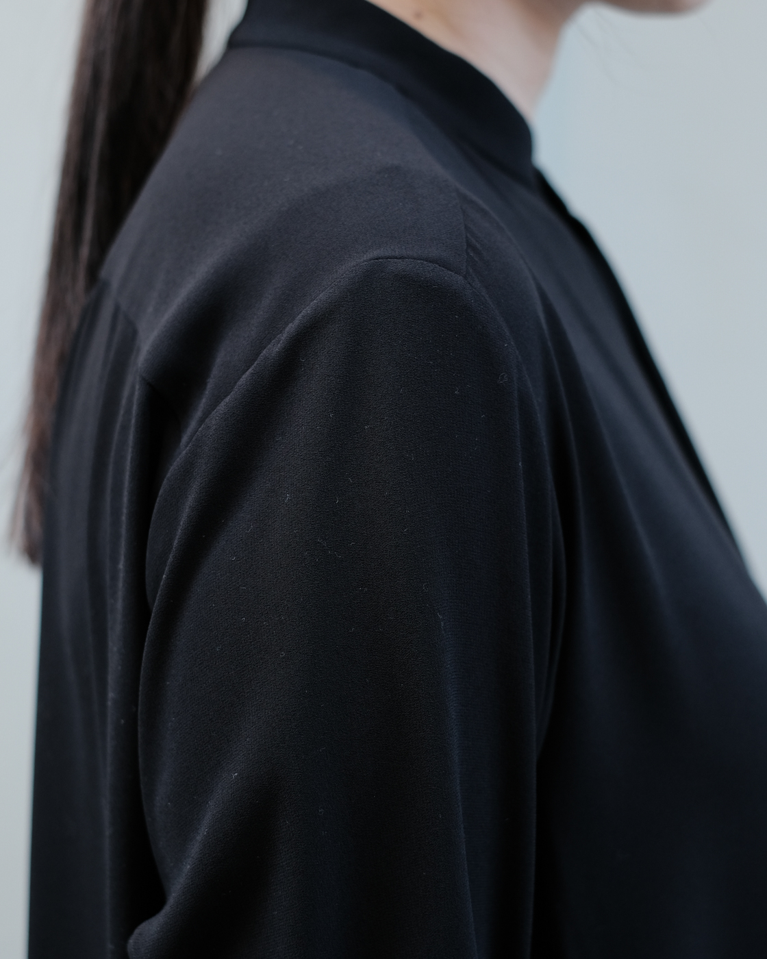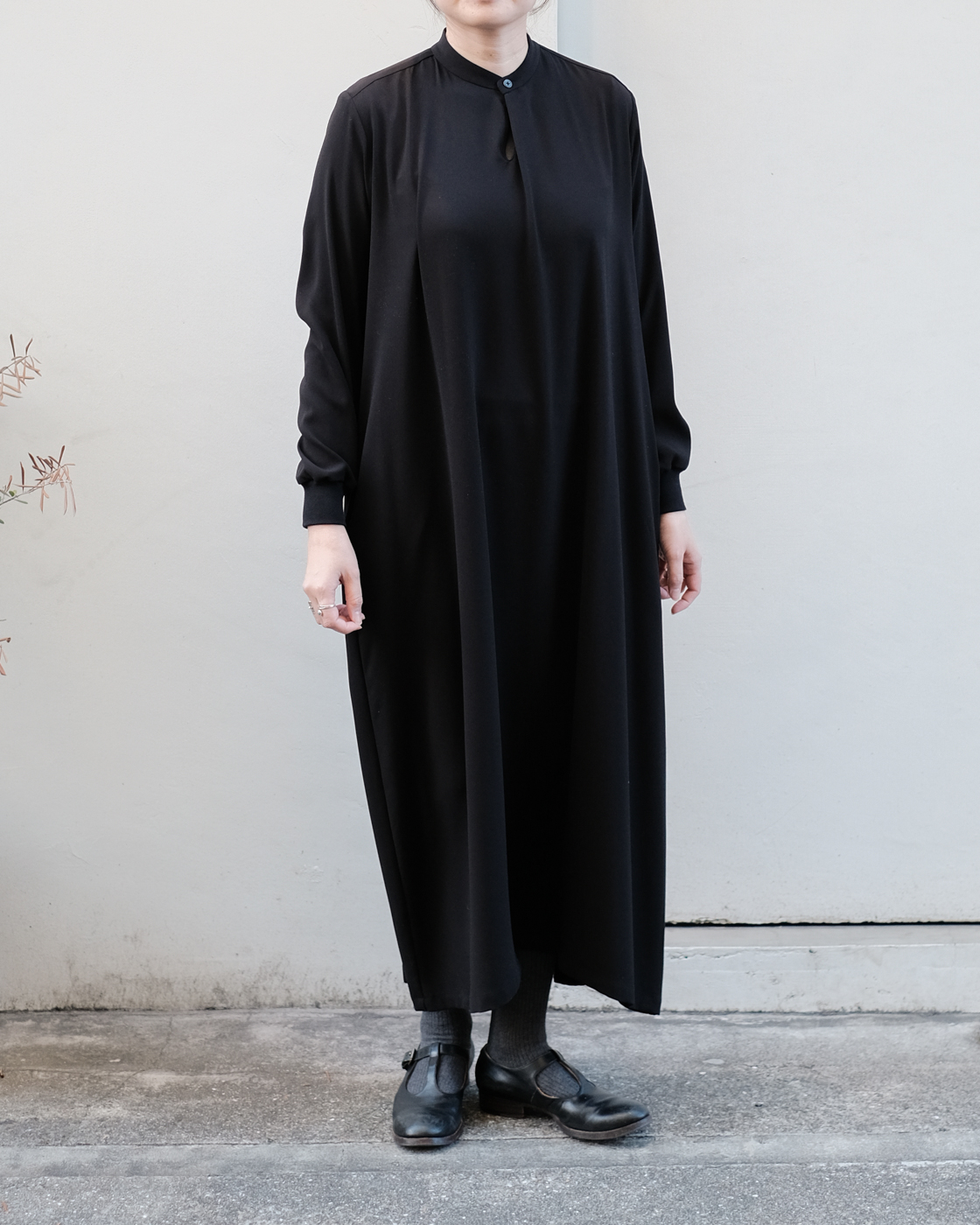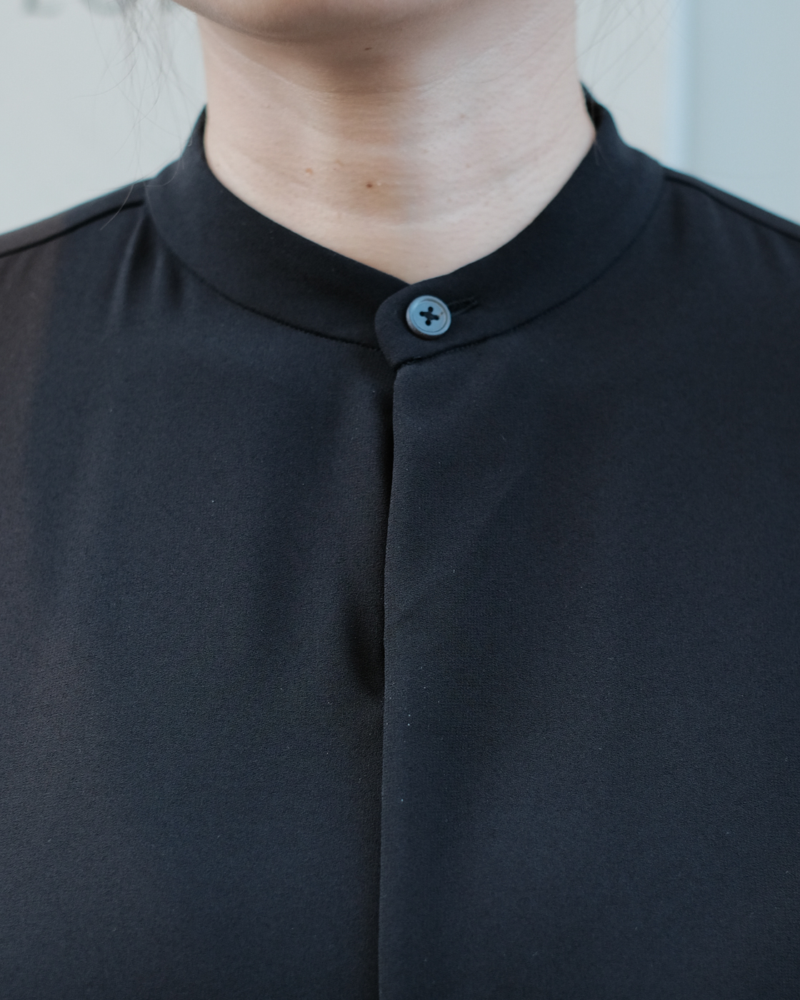 首元は一つボタンのバンドカラーで首のラインが綺麗に見えます。