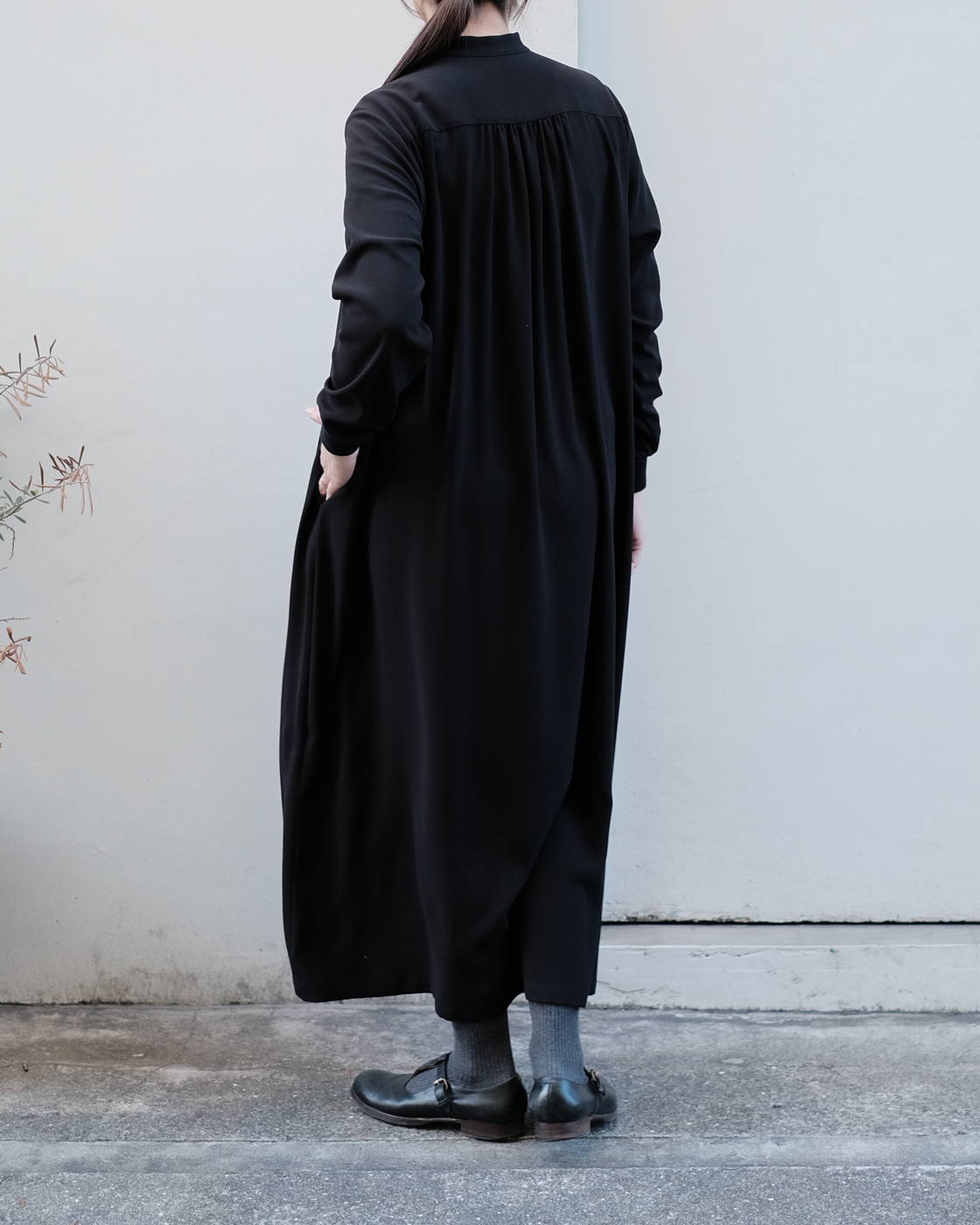 背中にはたっぷりとギャザーが寄せられており、裾に向かって流れるようなヒダが美しいデザインです。