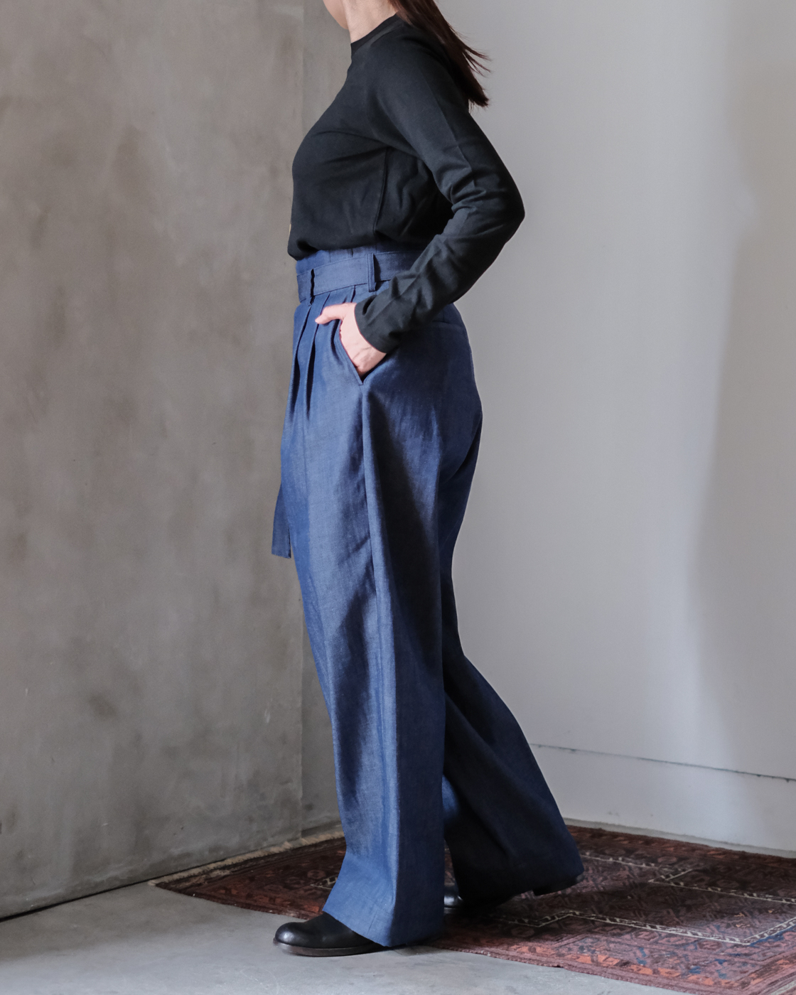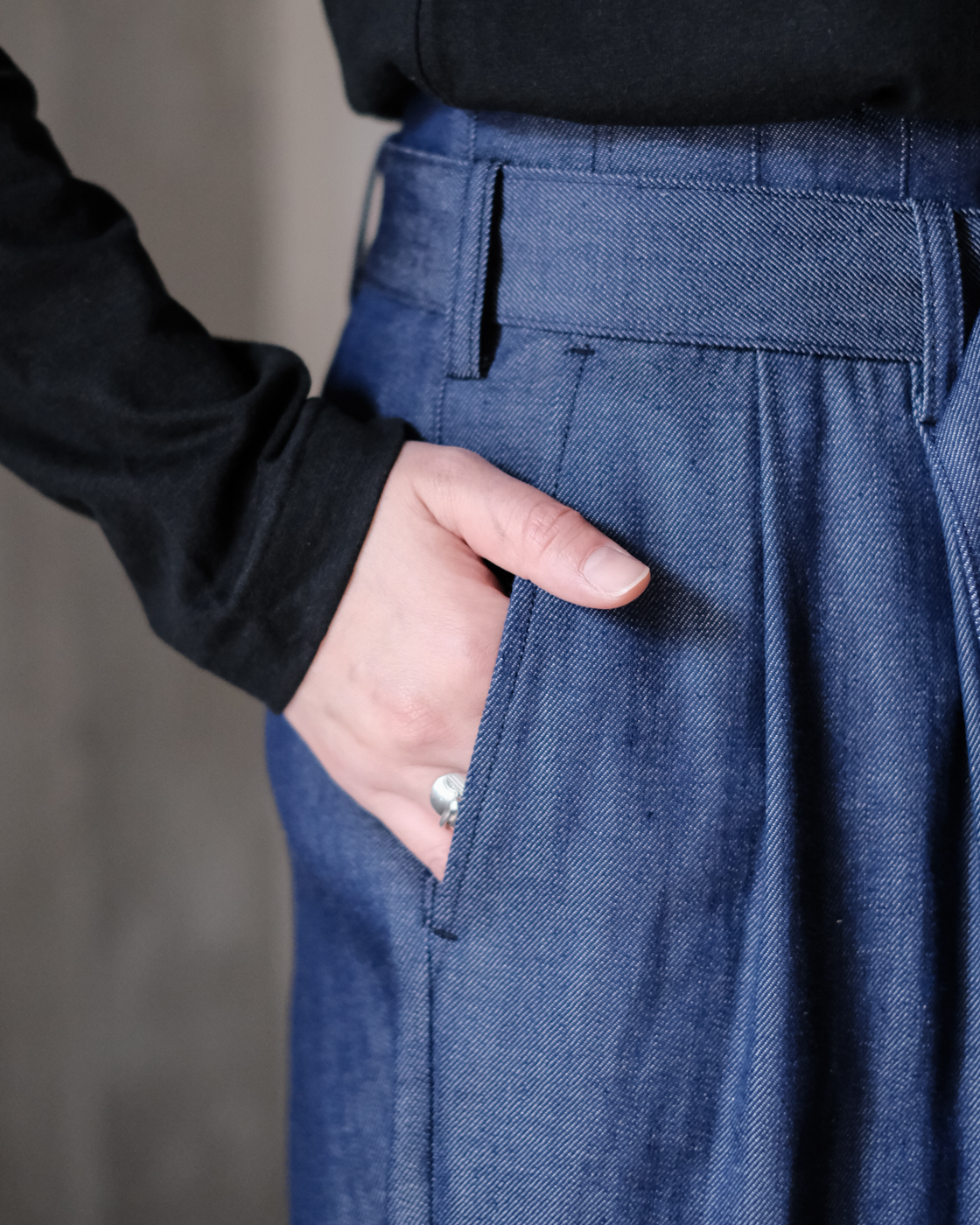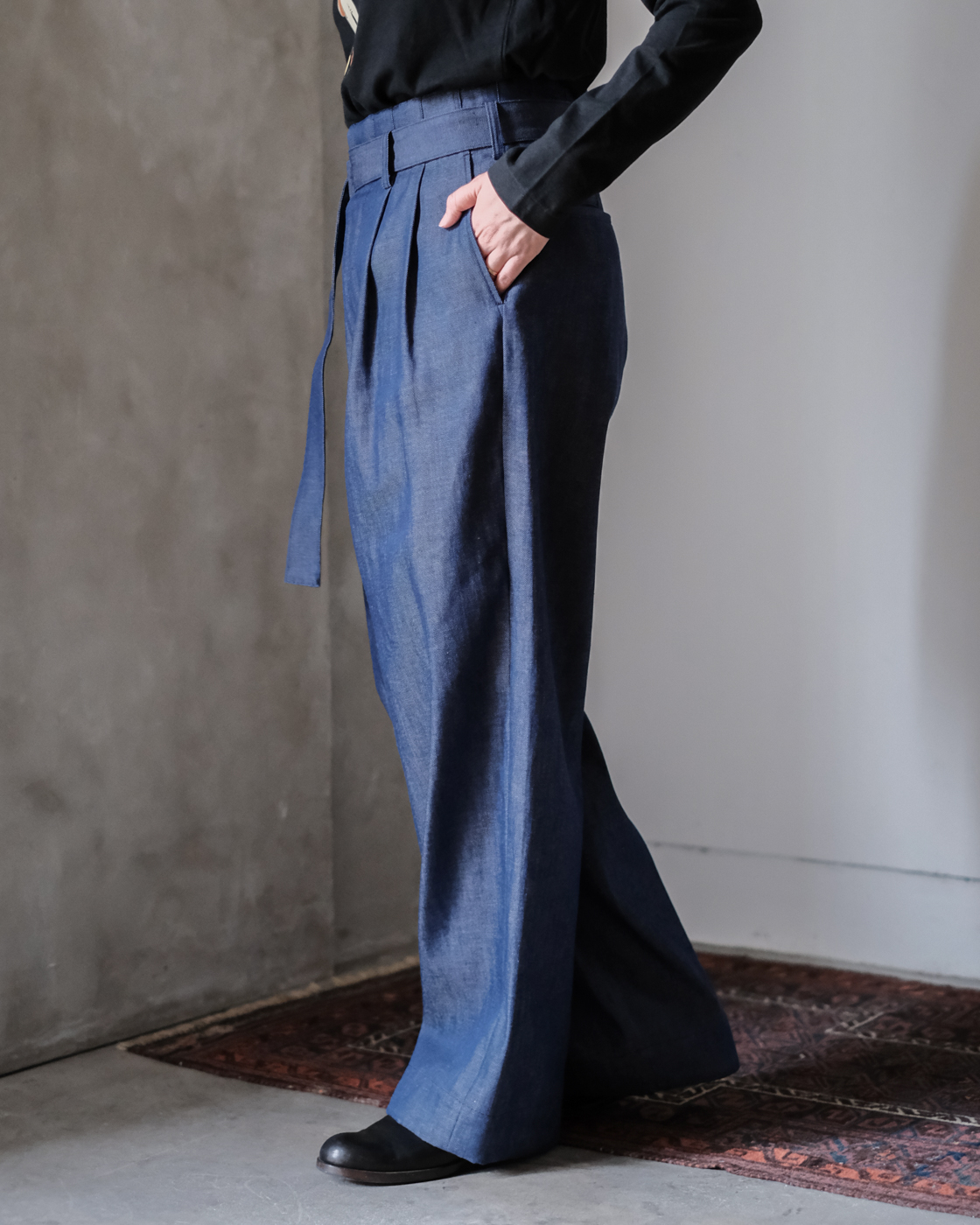 裾は太めに織り上げてあるので、足元に合わせてロールアップして頂くとダブル仕様のような雰囲気になり素敵です。
