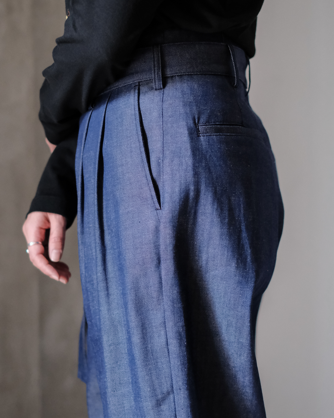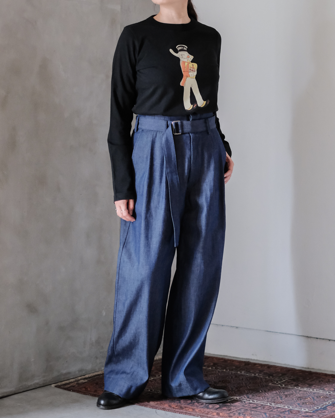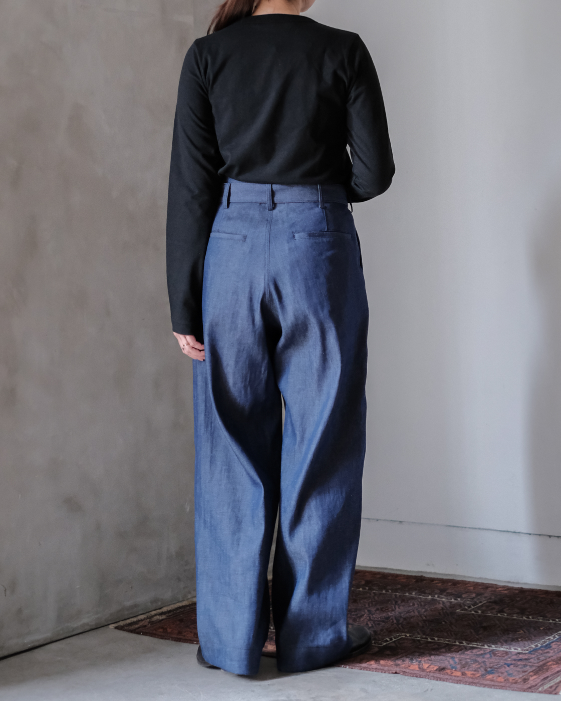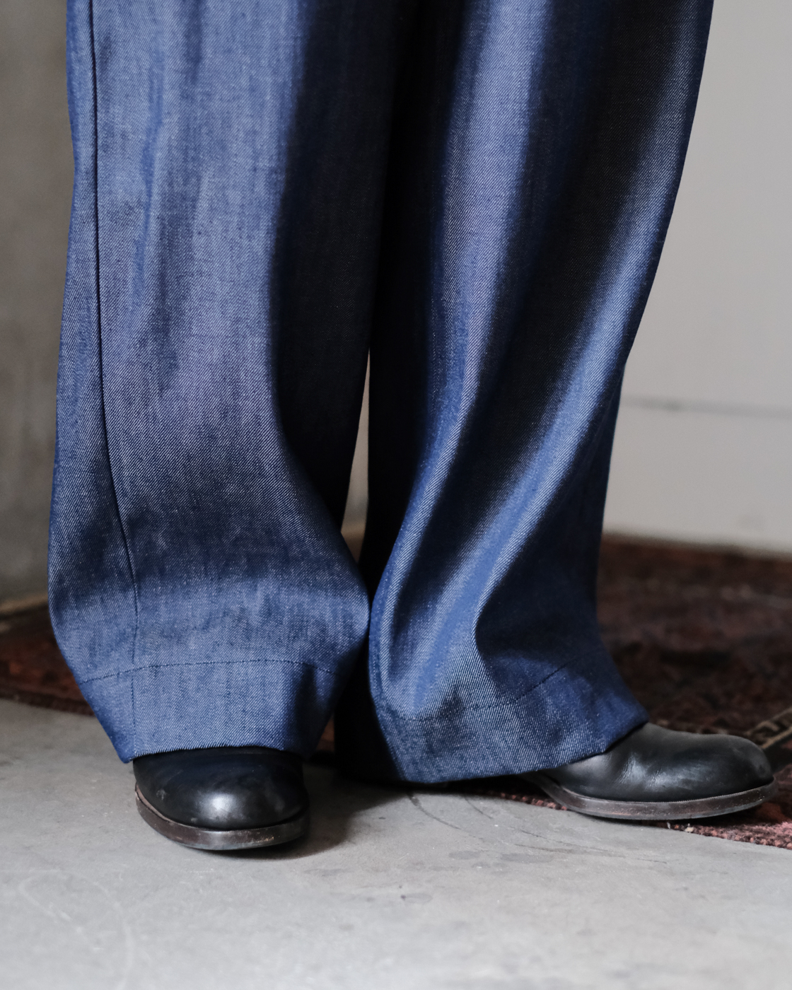 裾は太めに織り上げてあるので、足元に合わせてロールアップして頂くとダブル仕様のような雰囲気になり素敵です。