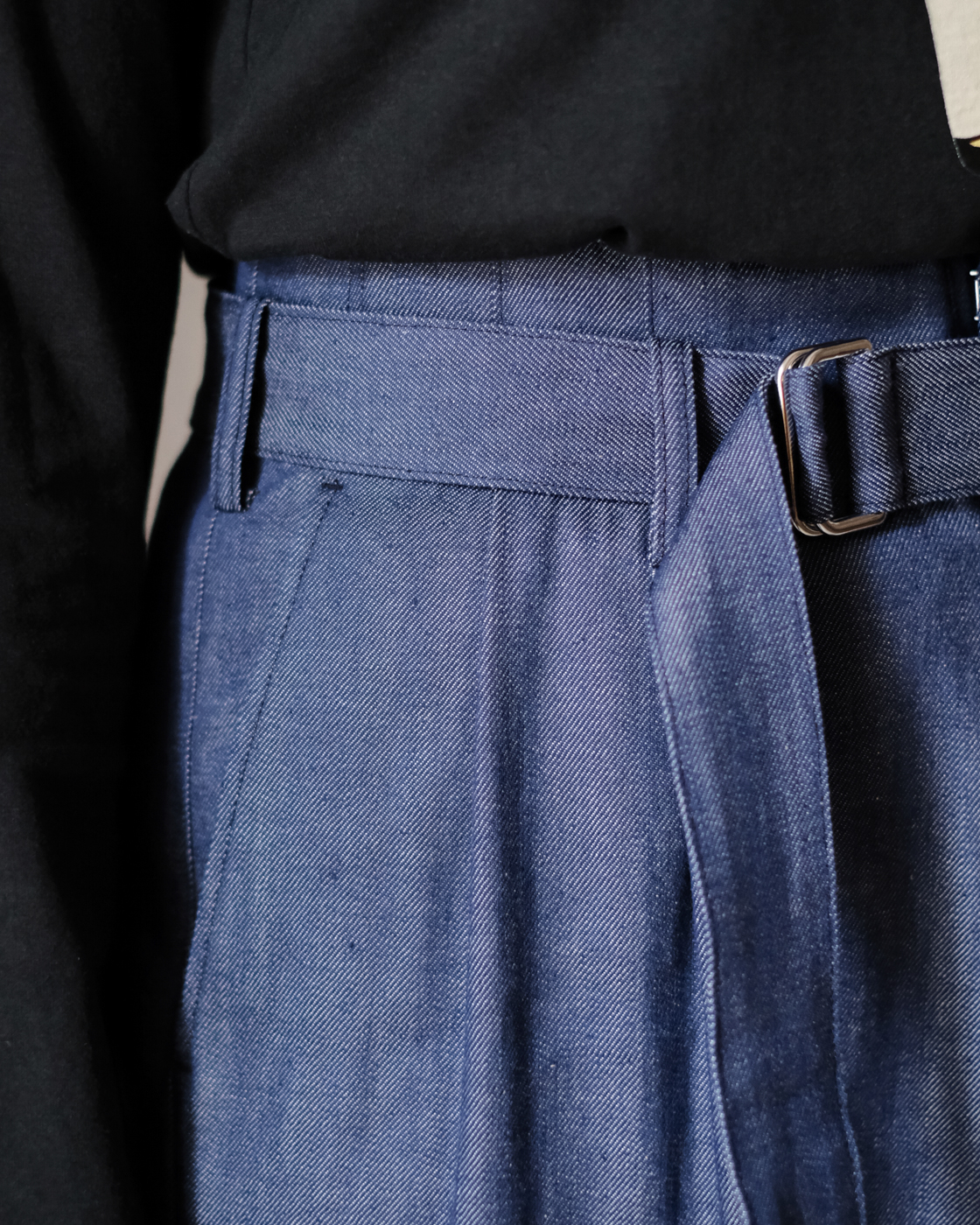 フロントにはタックが2箇所施されており、裾に向かって落ちる生地が立体感を生み、