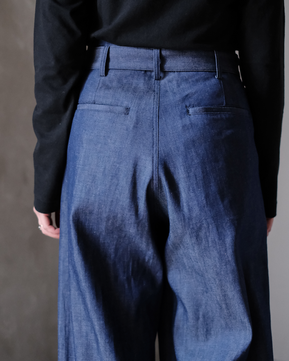 野暮ったい印象になりがちな太いパンツを女性らしく穿けるように、美しさにも拘ったデザイン。