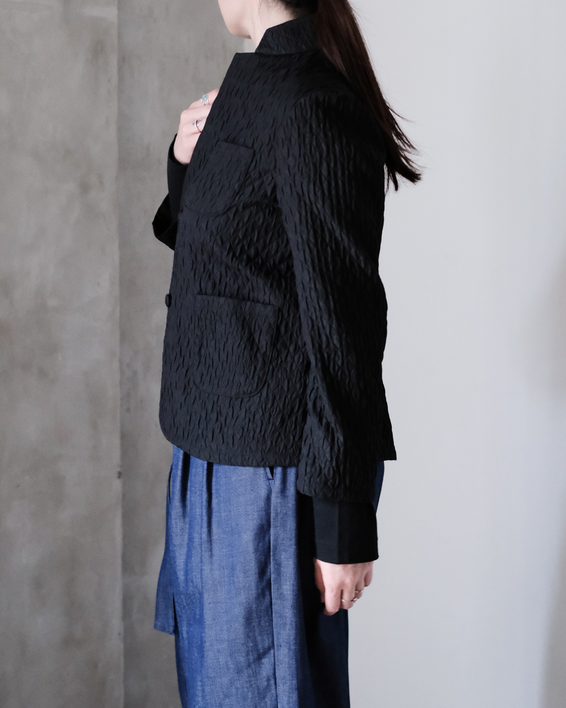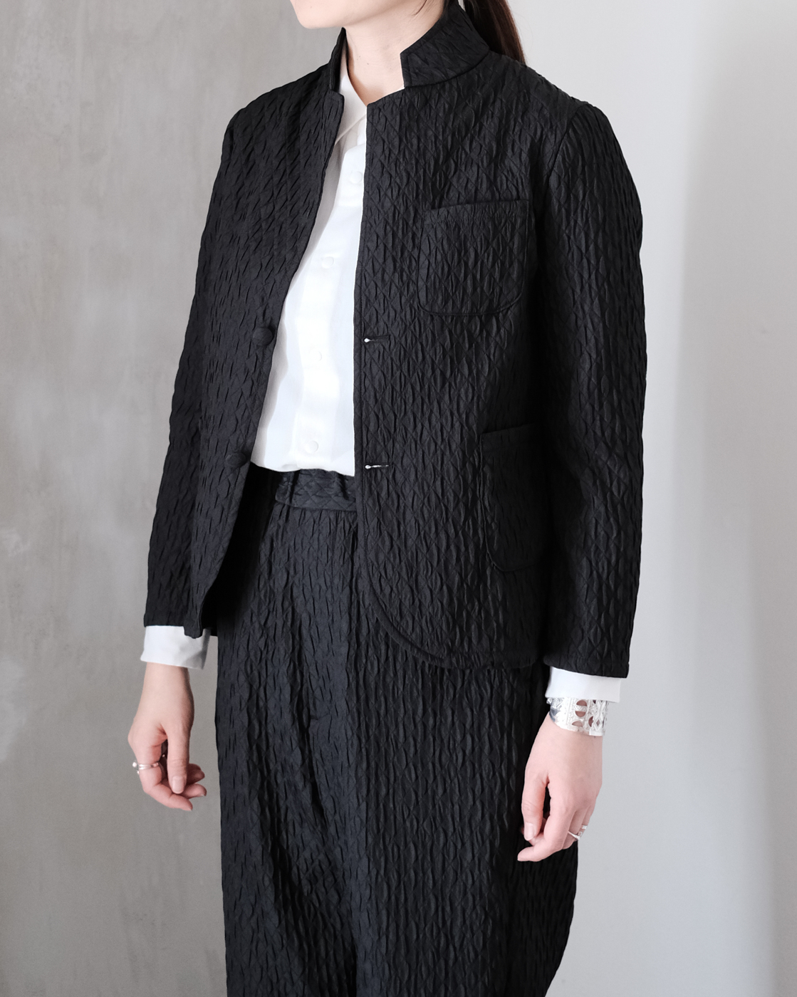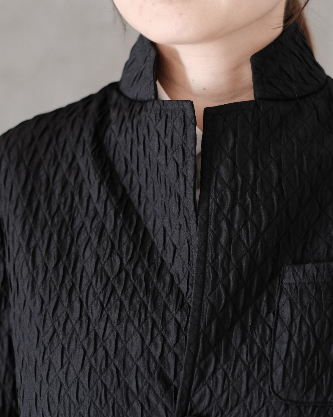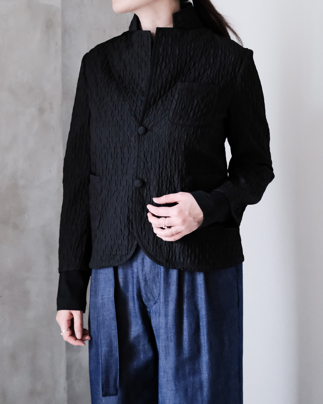 襟元も特徴的で、小さなラペルをそのまま立てたり、折ったりと、