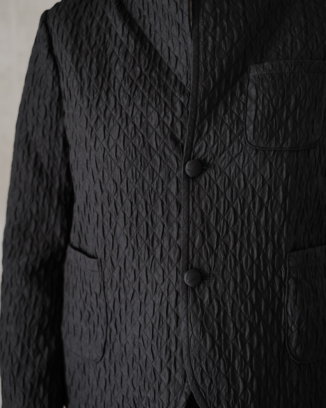 フロントには同素材のくるみボタンが2つ、左胸と左右に小さめなポケットが。