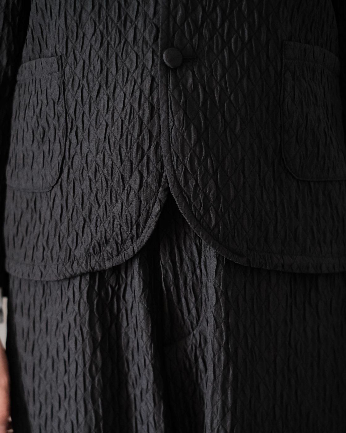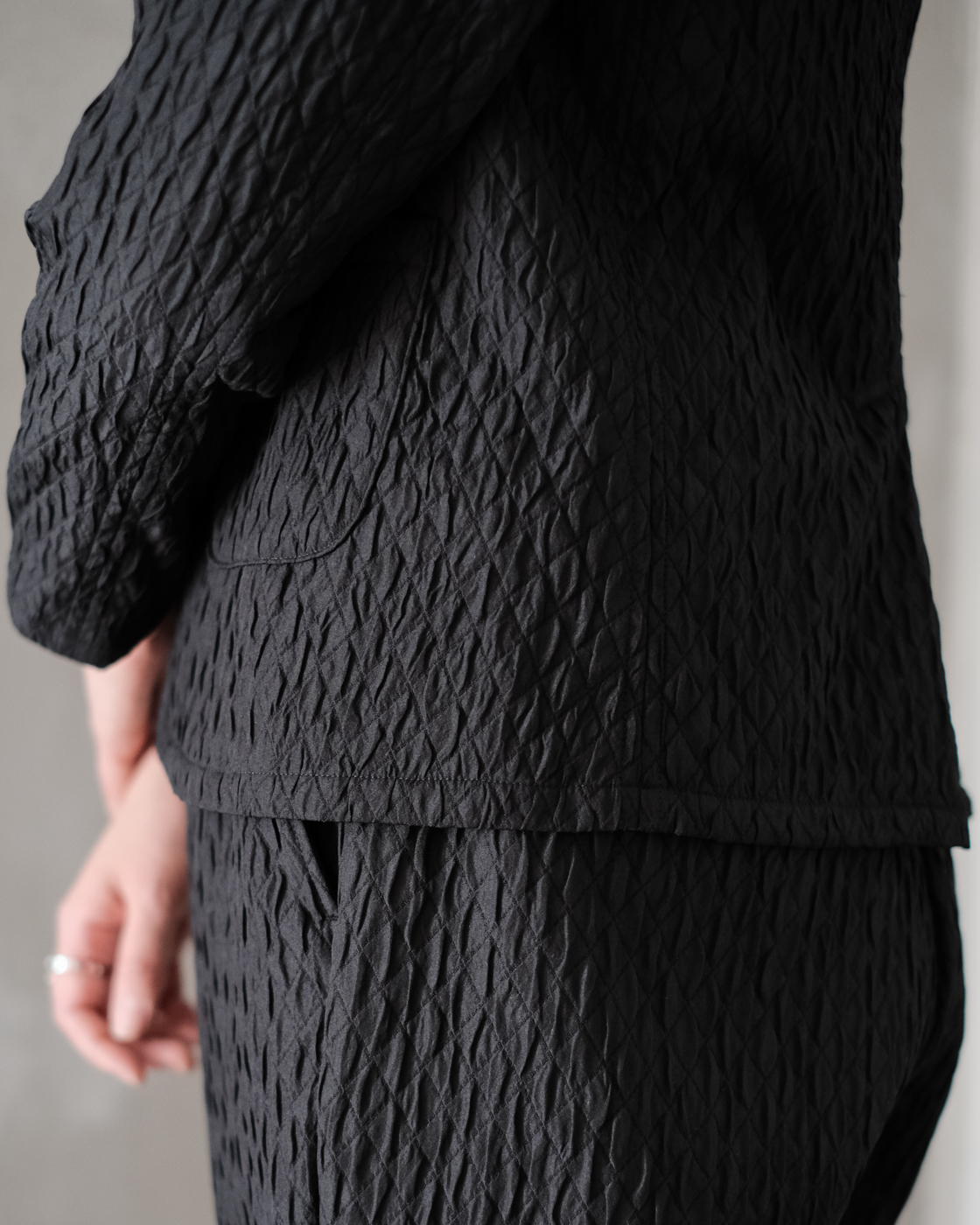 キルティングのように凹凸感のあるダイヤ柄が模様として浮き出るジャガード織りのマトラッセ。