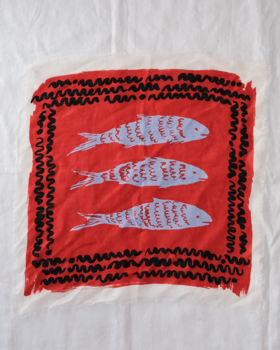 イギリスの陶芸家のレイチェル・コッカーによるスリップウェア皿からインスパイアされたマーケットフィッシュ柄のプリントです。